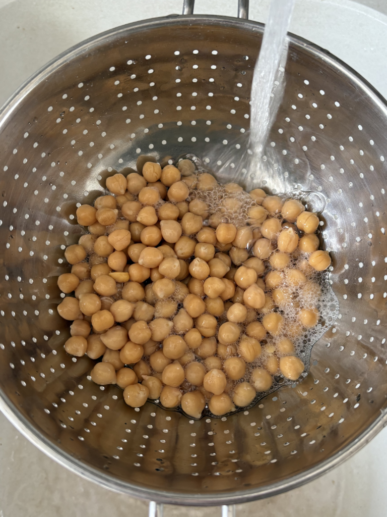 Sgocciola i ceci già pronti e lavali per bene. Dopo di che frullali con olio, succo di limone, un pizzico di sale e, se ti piace, uno spicchio d’aglio per dare un tocco in più. Lavora il tutto con il pimer fino a ottenere una crema liscia e vellutata, se ti serve ogni tanto aggiungi un po’ di acqua di cottura della pasta.