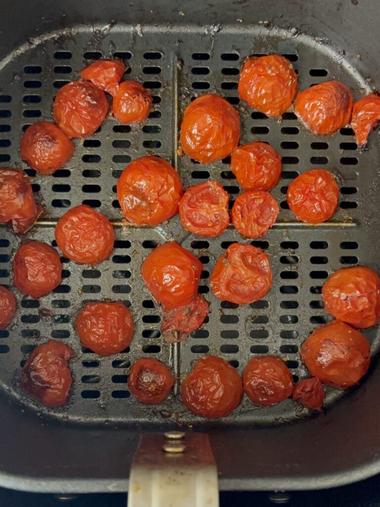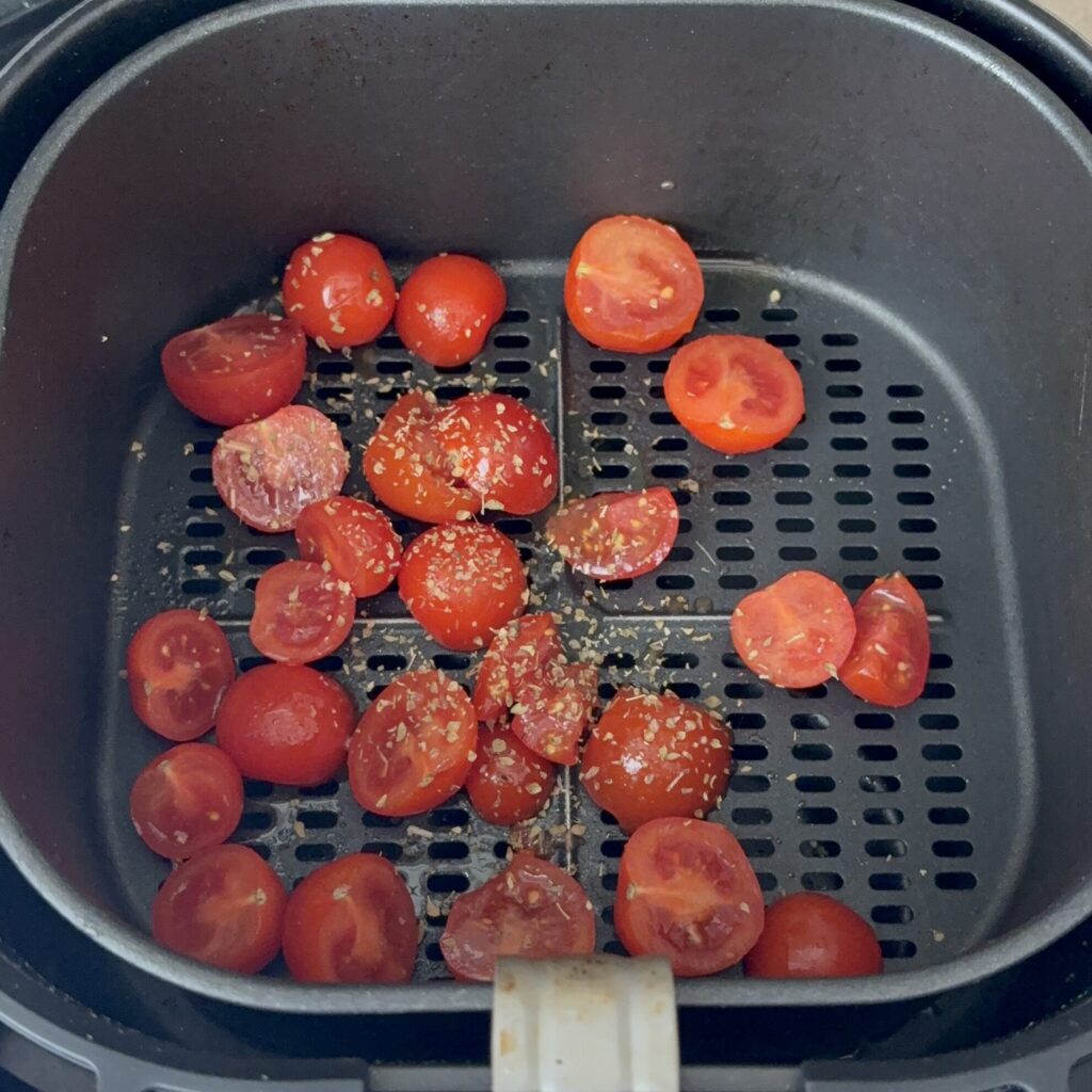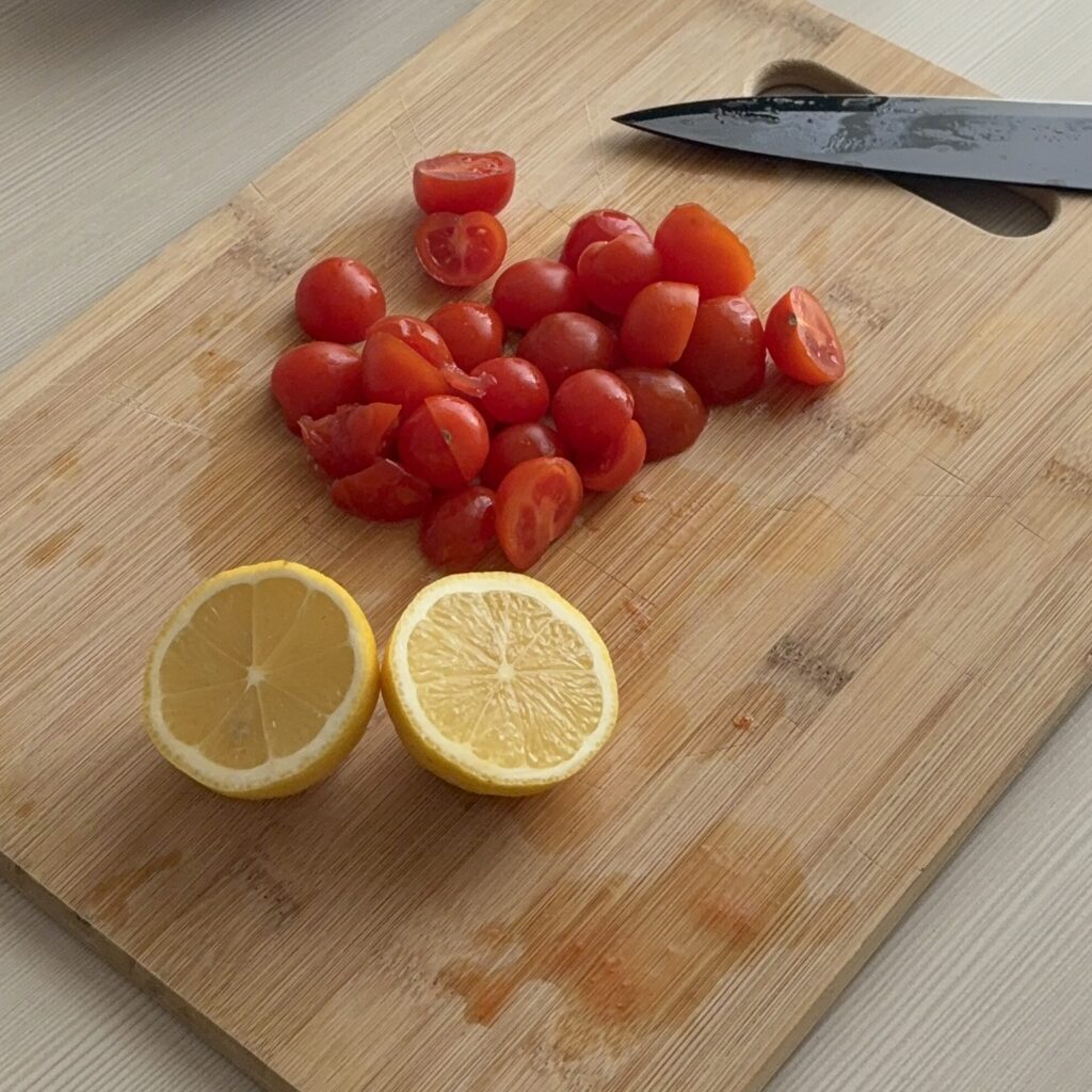 Metti sul fuoco una pentola d’acqua salata per cuocere la pasta, e nel mentre taglia il limone e pomodorini in due. Posiziona i pomodorini nella casseruola della friggitrice ad aria (o in una padella) con una spruzzata di olio, origano e un pizzico di sale. Lasciali cuocere finché non diventano morbidi e leggermente caramellati.