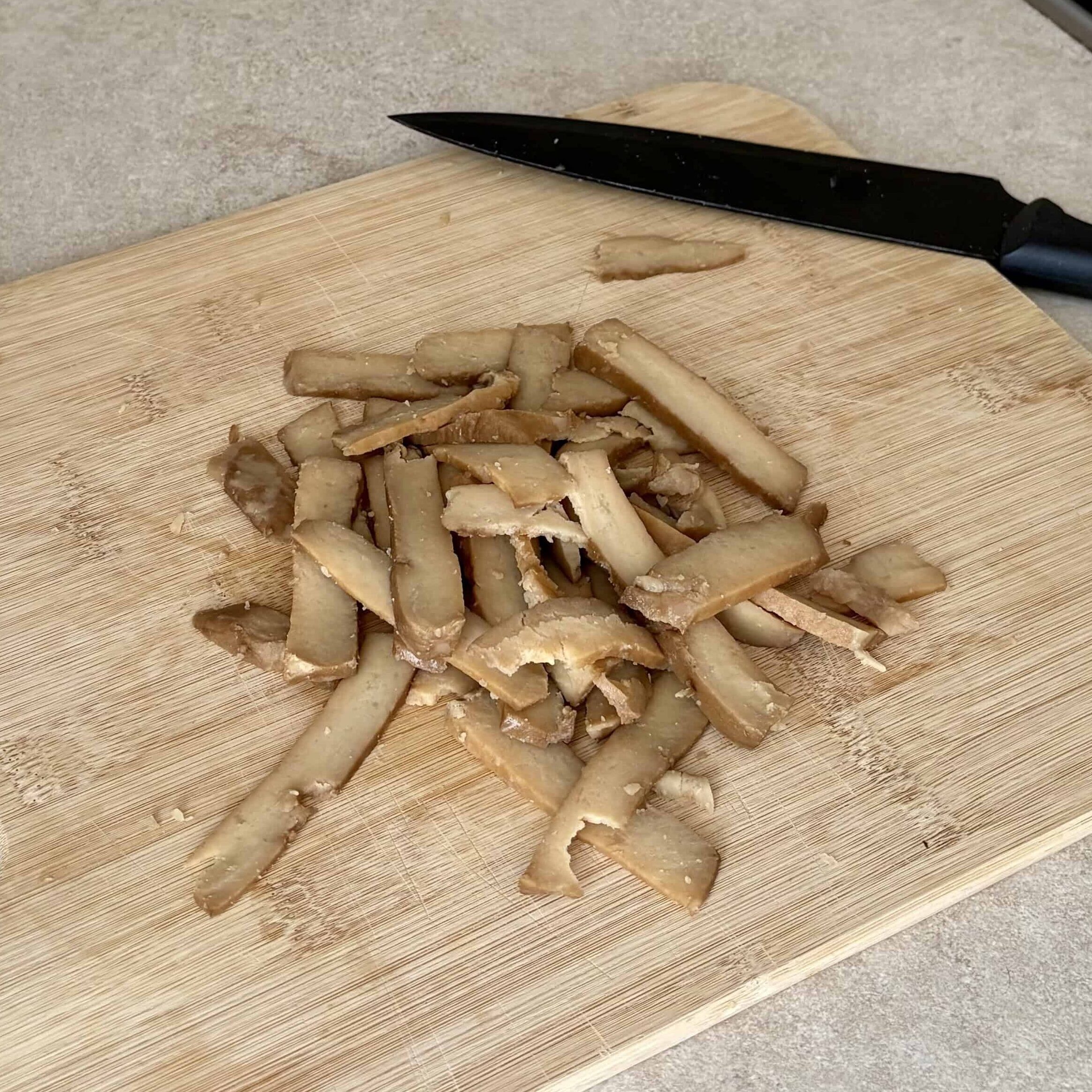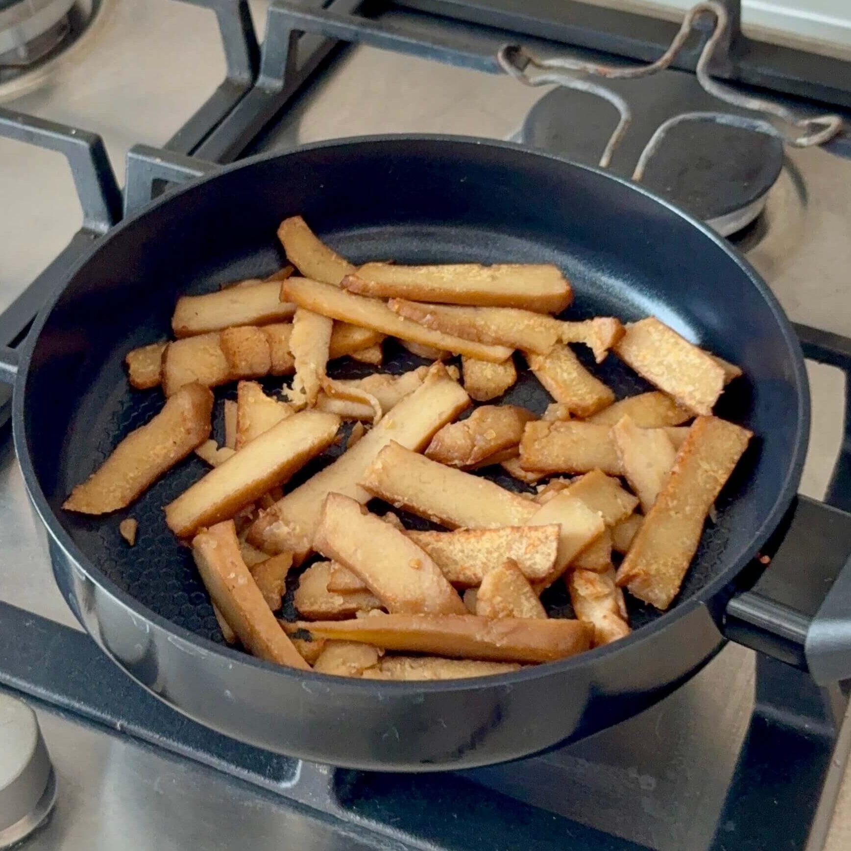 Metti a bollire l’acqua leggermente salata per gli udon noodles e, nel frattempo, occupati del seitan. Taglialo a fettine e fallo rosolare in padella con un filo d’olio, finché non diventa dorato.