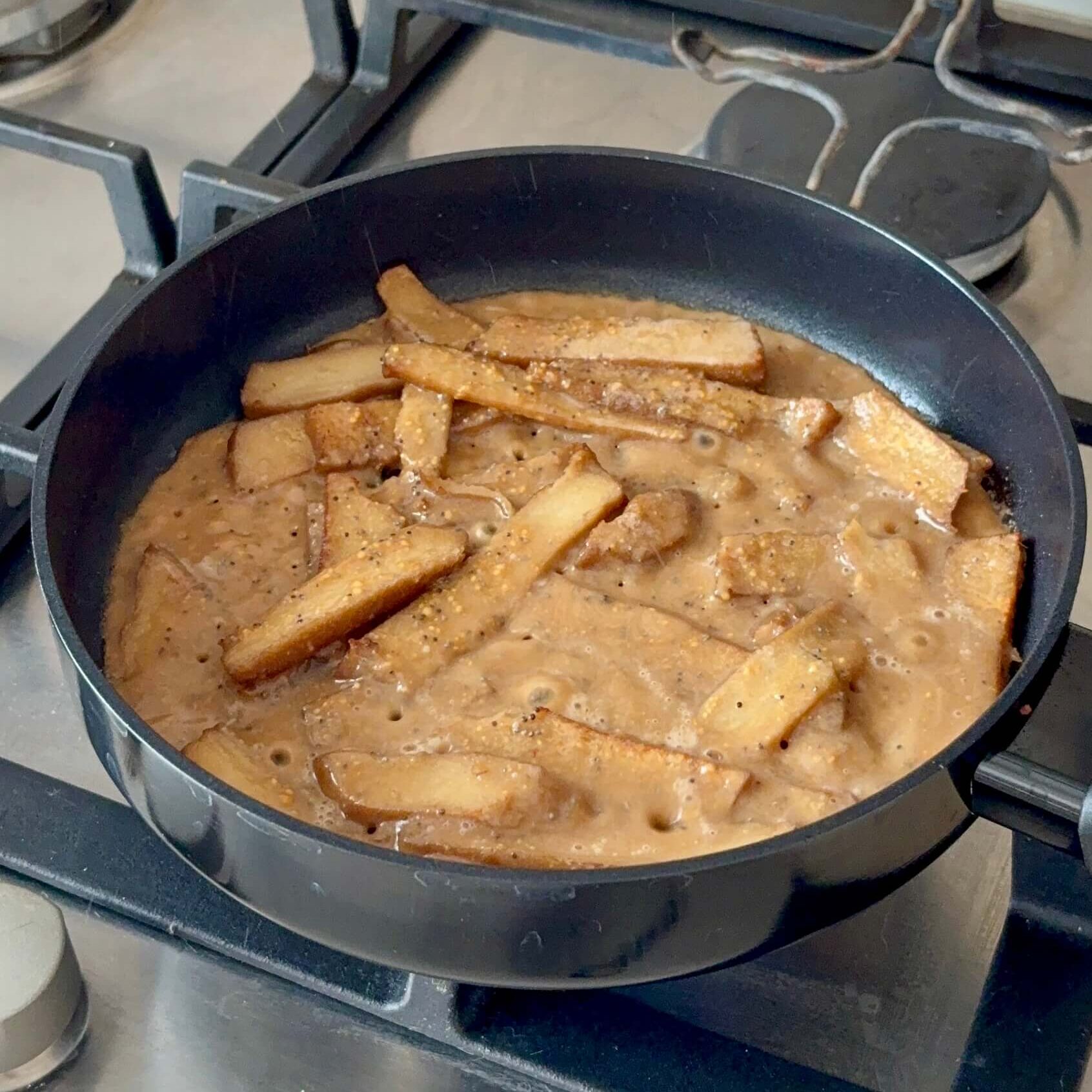 Versa la salsa in padella sul seitan e fai cuocere per qualche minuto a fuoco dolce, mescolando finché la salsa si addensa e ricopre bene ogni fettina.