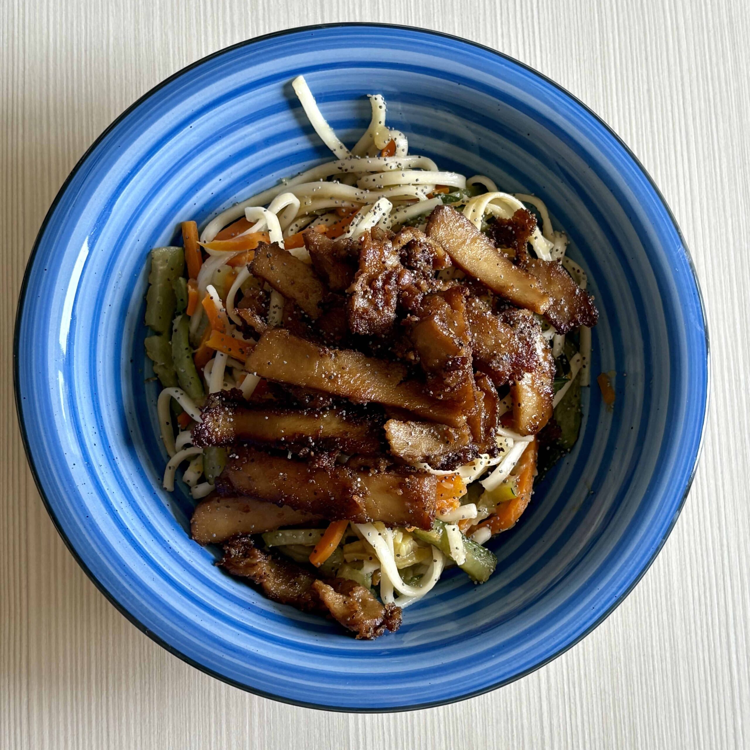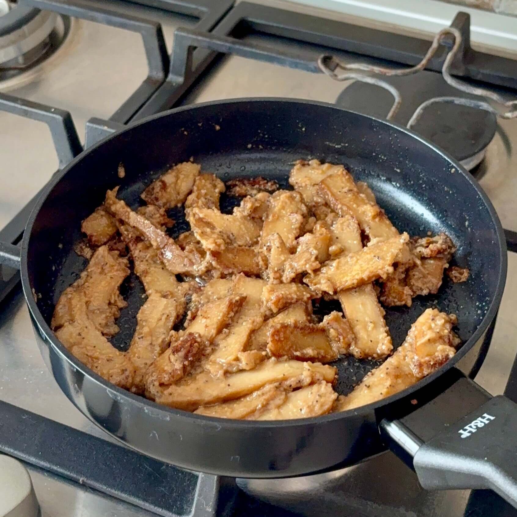 Il seitan è diventato morbido e gustoso, perfetto da abbinare a noodles e verdure saltate.