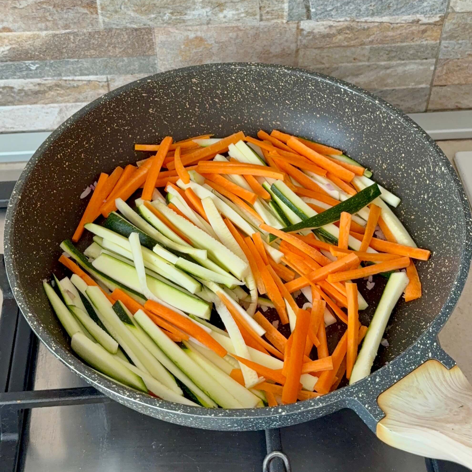 In un’altra padella, salta le verdure tagliate a bastoncini con dell’acqua.