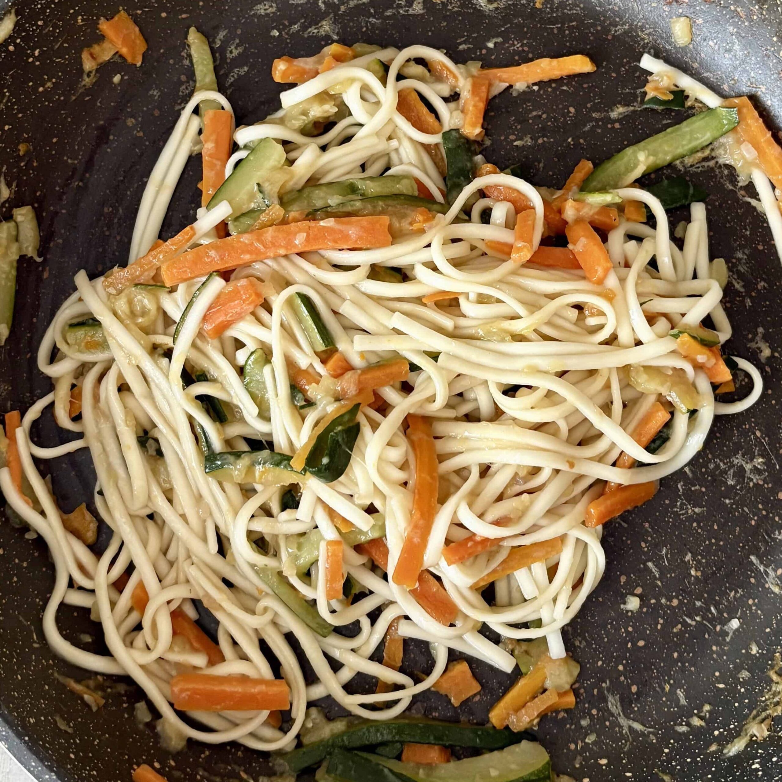 Cuoci i noodles, scolali e saltali insieme alle verdure per insaporirli.